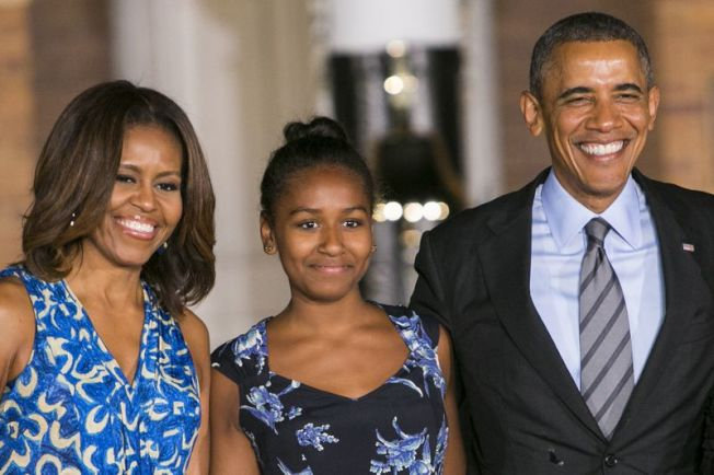 图为2014年萨莎与奥巴马夫妇的合影。(Getty Images)