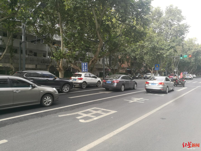 30日上午,记者来到剑南路西段绵阳市人民医院外面,从人民医院往金竹园方向是三条车道,其中最右侧车道有一个明显的标志“掉头专用车道”,而最左侧和中间一条车道则是直行标志,但道路中间的绿化带上,还有一块标牌,显示为“直行车道,禁止掉头”。