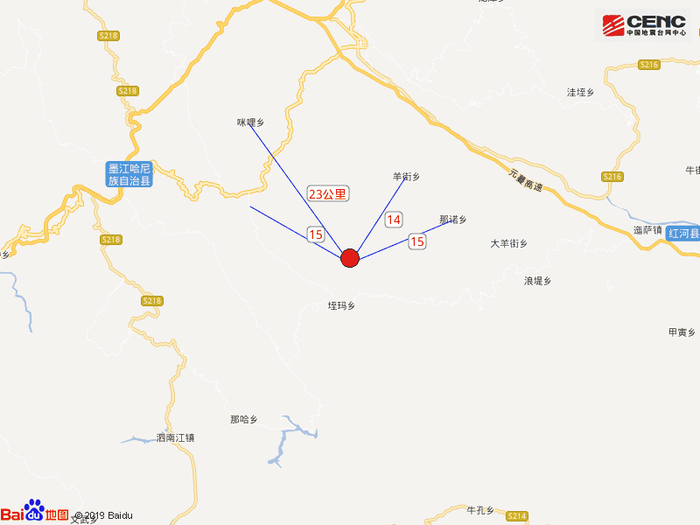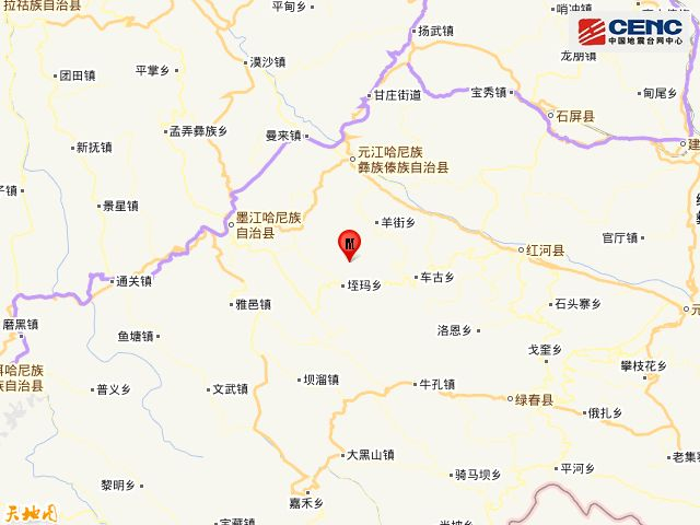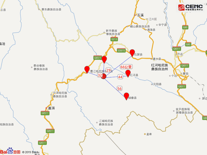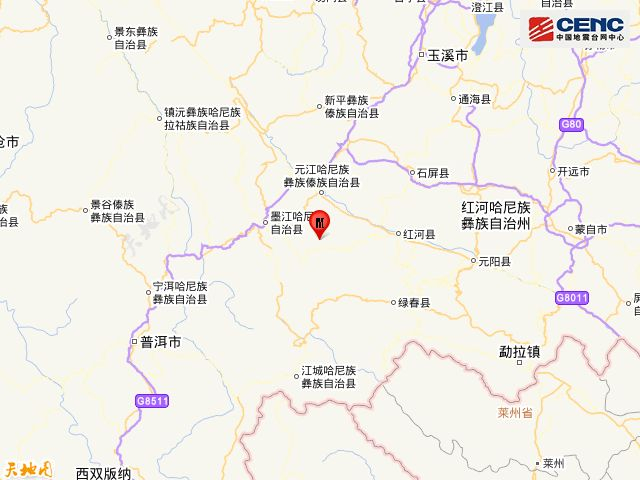 周边县城:震中距元江县29公里、距墨江哈尼族自治县32公里、距红河县44公里、距绿春县56公里、距石屏县66公里,距普洱市120公里,距昆明市203公里。