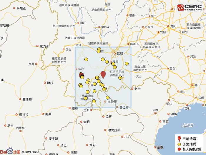 历史地震:根据中国地震台网速报目录,震中周边200公里内近5年来发生3级以上地震共113次,最大地震是2014年10月7日在云南省普洱市景谷傣族彝族自治县发生的6.6级地震(距离本次震中157公里),按震级大小前50次历史地震分布如图。