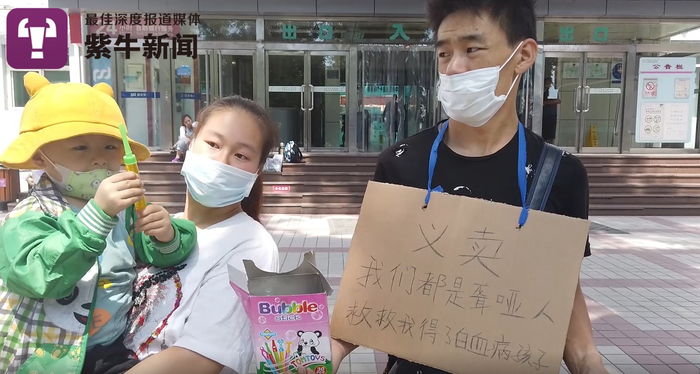 扬子晚报紫牛新闻记者采访了解到,视频里的一幕发生在山西太原市。视频里的抱在手里的孩子他叫小鑫瑞,今年3岁多,本是个活泼可爱的孩子,可是今年6月不幸被查出患有白血病。他的爸爸杨春青、妈妈蓝金金,都因小时候患病,成为了聋哑人。他们没有什么收入,家里的开销都靠年迈的爷爷奶奶种田维持。小鑫瑞的病情严重,花费也巨大,很快家里山穷水尽,父母为了给孩子筹款,无奈之下走上街头进行义卖,希望通过这种无声的方式,给小鑫瑞带来希望。