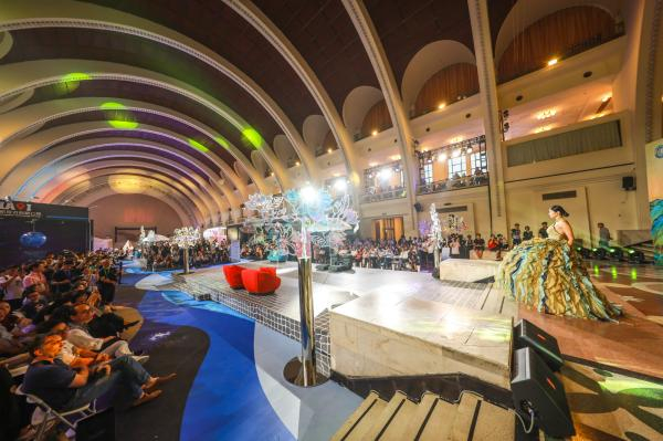 序厅背后的中央大厅也延续了“海”的主题设计,被打造成一个中央通道带有“泳池”设计的走秀场。8月30日下午,上海美术学院的非遗跨界时尚秀在这里举行。这场时尚秀精选38典非遗跨界服饰,涉及18项非遗技艺,由36位设计师和非遗传承人牵手创作,涉及的非遗技艺有苏州缂丝、四川蜀绣、阿坝羌绣、上海顾绣、剑河锡绣、陕西刺绣、牦牛绒、畲族织带、果洛银饰锻造、贵州遵义竹编、蒙镶制作技艺等,展现了传统工艺和现代设计的跨界融合。