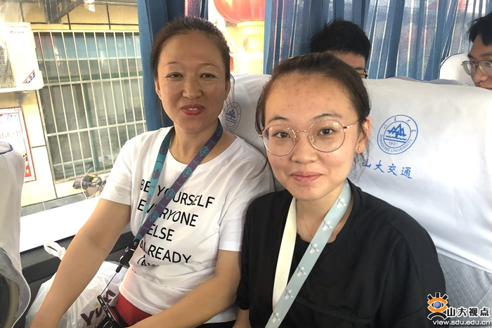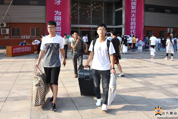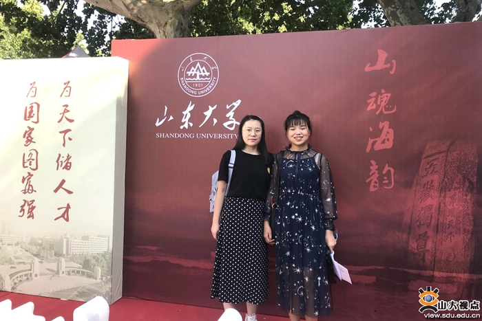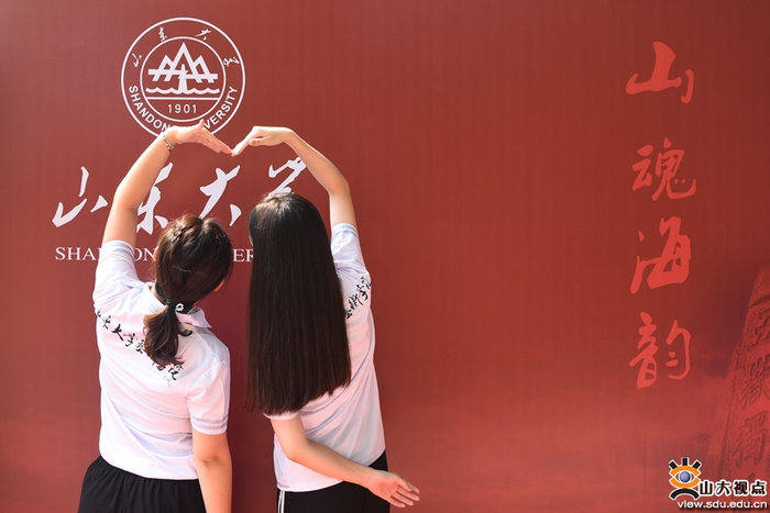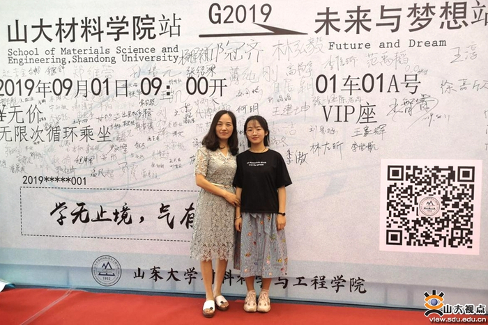 不远千里,跋涉而来。陕西来的徐嘉欣(右)从材料学院完成报到后,在学院展板前合影留念。山大是她非常喜欢的学校,“文化底蕴深厚,实力强悍,风景优美”。不远千里的跋涉之后,她告诉自己,要更加努力,成为优秀的山大学子。