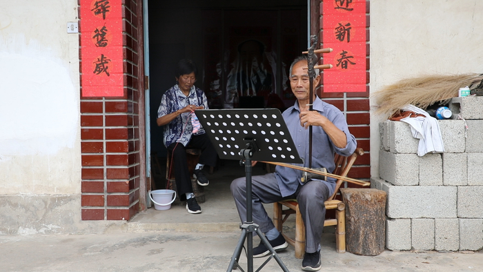 蓝开友在院子里拉二胡、唱畲歌。