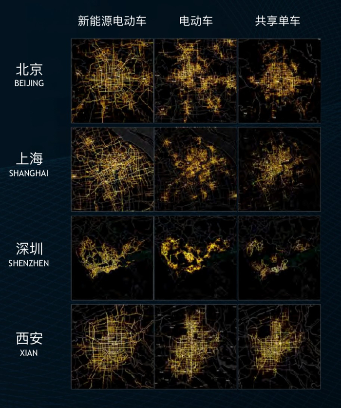 越来越多的数据给了我们更多的维度认识城市和出行,同样都是车辆轨迹,不同的交通方式给我们呈现出不同的城市结构特征——新能源汽车对于城市机动化交通的描述,共享单车对于慢行系统的描述,快递外卖的轨迹对于商圈的呈现。