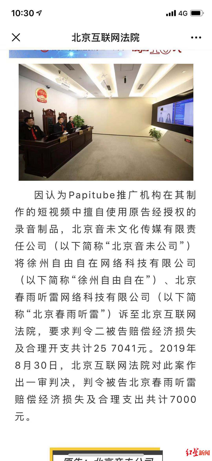 papi酱公司短视频配乐涉侵权判赔7000元 原告:继续上诉