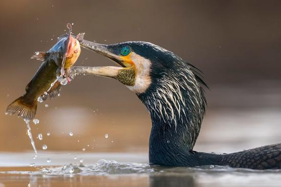 来自英国的摄影师卡隆·斯蒂尔(Caron Steele),凭借其拍摄的一张鹈鹕在希腊 Kerkini 湖上跳跃起飞的照片夺得“年度最佳鸟类摄影师”称号,同时获得了 5000 英镑(人民币约 4.37 万元)奖金。
