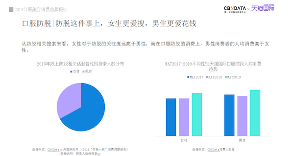 天猫国际最近在上海发布《2019口服美容消费趋势报告》。数据显示,80后、85后消费者热衷于抗糖概念相关产品,90后和95女性消费者则撑起了口服美容品市场的半壁江山,而男性消费者对于口服防脱类产品的关注度也相当之高。口服抗老、口服美白、口服补水成了口服美容品市场关注度前三的主题,而紧接其后的便是口服防脱产品,有意思的是,虽然关注口服抗老品的女性消费者更多,但在人均消费上,男性消费者却更胜一筹。