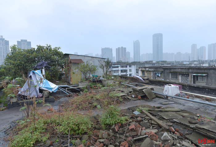 9月3日,红星新闻记者来到该小区,辜婆婆所在单元楼一共7层,她家位于6楼,枇杷树是由7楼住户在天台上种植。从7楼通往天台原本仅设计了一个通风口,记者在7楼住户门口看到,该住户搭建了一个木楼梯可以爬上天台。在该住户的天台上方搭建了花台,种植了不少花草树木,还有一个铁皮小屋。而在辜婆婆及另外一户漏水的住户上方,有一些杂草杂树,最大的枇杷树未在该方向。