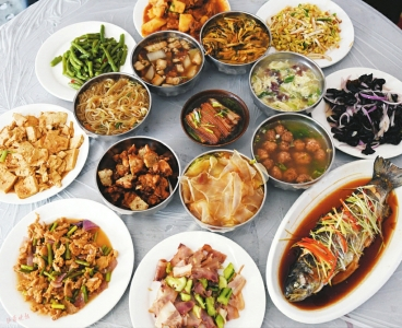 据为老人们做菜的吴师傅介绍,八大碗包括四荤四素,有大肉(红烧肉)、肘肉、酥肉、丸子、金针海带、炖粉条、炖粉皮、蛋花汤。除了八大碗,还有根据现有当季食材选取制作的八大盘。八盘八碗全部选用当地自产的食材,每道菜都是经过炸、炒、蒸制而成,而且全部是带汤的。菜也是一道一道地按顺序上席。