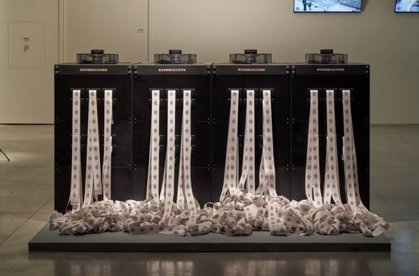 在展厅中不停喷吐纸张的打印机,恰恰是作品《爱丽丝和鲍勃》的一部分。这是由艺术家安娜·瑞德尔和数字艺术家达莉娅·叶罗勒克一起创作的装置,原理在于用物理学论文训练神经网络,发现相同语言在不同学科语境中的解释空间,从而写出永不重复的“情书”。另一件与之相似、也不停喷吐纸条的机器是拉比特姐妹的作品《数据油田:快闪流量税和黑客运动》。这是一件基于互联网的艺术装置,也是一个大数据时代的批判工具,由一群在推特上刷流量的社交机器人和线下装置产生互动。