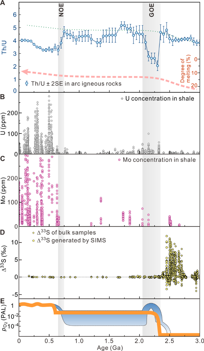 全球第一次氧化事件被称为“大氧化事件”,开始于大约24亿年前,结束于大约21亿年前,其发生和结束时间原是基于沉积岩的硫同位素和碳同位素组成变化而限定的。刘鹤等首次采用岩浆岩的成分精确限定“大氧化事件”的时代,弧岩浆岩的平均Th/U变化也进一步证实了在24~21亿年前大气和海水中的氧含量曾发生过一次大规模的先升高再降低的事件。全球第二次氧化事件被称为“新元古代氧化事件”,发生于大约7.5亿年前。这次氧化事件以后,地球上的氧气没有大幅度回落,而是在相对较高的含量范围内变化,从而为埃迪卡拉纪动物繁盛(5.8亿年前)和寒武纪生命大爆发(5.4亿年前)奠定了基础。弧岩浆岩的Th/U在7.5亿年前大幅度降低,昭示着大气-海水中的氧含量大规模升高,这与前人通过沉积岩的Cr同位素组成、Mo元素含量以及硫酸盐蒸发岩定年的研究成果相一致。