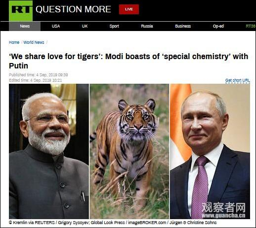 今日俄罗斯网站提到,在3日出发前往俄罗斯前,莫迪还说自己和普京有“特殊的化学反应”,因为两人都“爱老虎”。