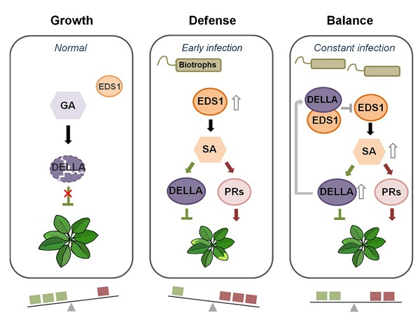 中国科学院华南植物园分子生物分析及遗传改良研究中心组助理研究员李宇歌在研究员侯兴亮的指导下,对植物协调生长-防御平衡调控课题开展了长期观察和研究。DELLA蛋白是赤霉素(GA)信号途径的核心负调控因子,在众多植物生长发育过程中扮演抑制角色,同时也参与植物逆境胁迫响应的调控。该研究通过酵母双杂交筛选发现,DELLA蛋白可与植物关键抗病因子EDS1发生蛋白互作;进一步分析证实DELLA-EDS1模块在植物面临活体营养型菌Pst DC3000侵染时发挥生物学功能;在EDS1存在的情况下,病菌及水杨酸(SA)可稳定DELLA蛋白免遭GA的降解,以此抑制植物的生长;而DELLA可抑制EDS1对下游靶基因启动子的结合,来抑制抗病基因的表达。