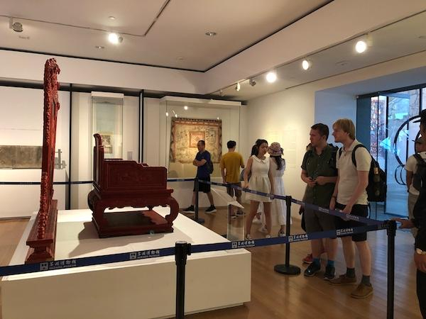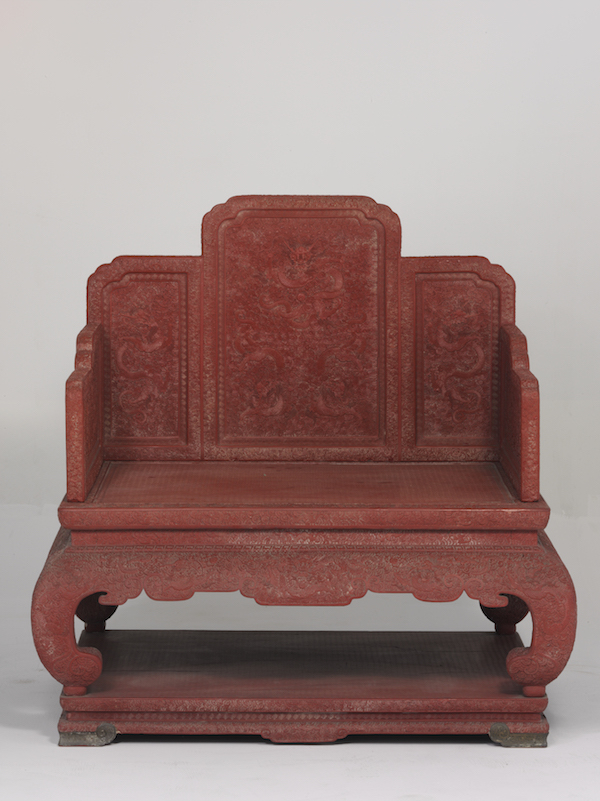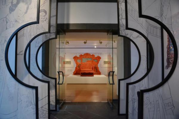 而在展厅中间对立展出的是东魏武定元年翟门生屏风石床和清剔红宝座、清乾隆剔红围屏。其中东魏武定元年翟门生屏风石床尤具历史感,让观者的思维一下穿越到了其所处的时代。屏风石床是北魏时期新出现的一种葬具,一般形式是三面石围屏,上浅浮数组图案,以边界开,示意为多扇屏组合而成。此屏风石出不石围屏以及石阙、石枕等十一件构件组成。石围屏共4件,正反两面布局对称,各有12幅图,正面以男女墓主人宴会场景为中心,搭配儒家孝文化经典故事。背面刻一组完整的“竹林七贤与荣后期”人物画像,这在屏风石床上是少见的题材,在正面主坐像屏风石上有“胡客翟门生造石床屏风吉利铭记”铭文,翟门生是北魏时期出生在西域翟国的胡人。根据墓志记载,他作为商队的首领,频繁往来于中亚、中原之间,逐渐接受并融入了中原的生活方式。他的一生再现了南北朝时期外来民族融入中原的社会图景,是丝绸之路的重要文化见证。