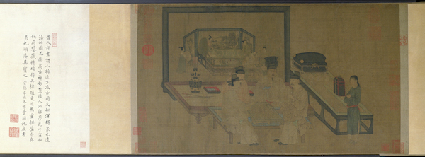 芝加哥艺术学院藏的《合乐图》卷位于进门展厅右侧,此卷描绘的是皇家贵族乐团。乐师们或单独或成对地演奏大鼓、拍板、竖笛、横笛、细腰鼓、锣、筝、琵琶等乐器,这些乐器精确地表现了唐代中期宫廷乐府所演奏的乐器,与现存文物和纸稿中所记载的一致。此卷中所描绘的听众与故宫博物院所藏《韩熙载夜宴图》中描绘的宫廷人物极其相似,作者可能是从早先的艺术作品中汲取了众多灵感,从而创作出这幅让人回想起前朝艺术的“合成作品”。《韩熙载夜宴图》据传为五代时期南唐画家顾闳中的作品。此卷旧传周文矩所作,而顾闳中与周文矩为同时代的画家,作者在这里构造了另一种形式的屏,两架屏风立于长髯士人背后,突出其尊贵地位。里层屏风的留白既映衬前面的画上人,又突出了它身后的另一扇屏风。装饰上两架屏风亦有不同,互相对照。