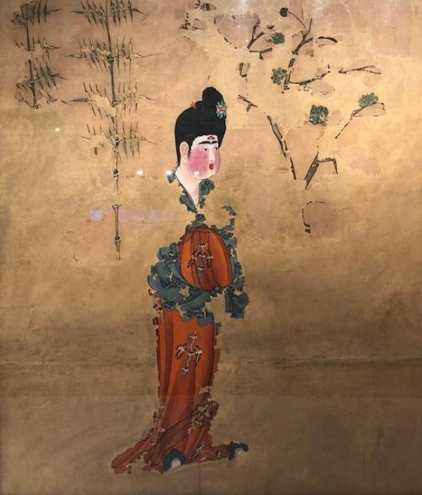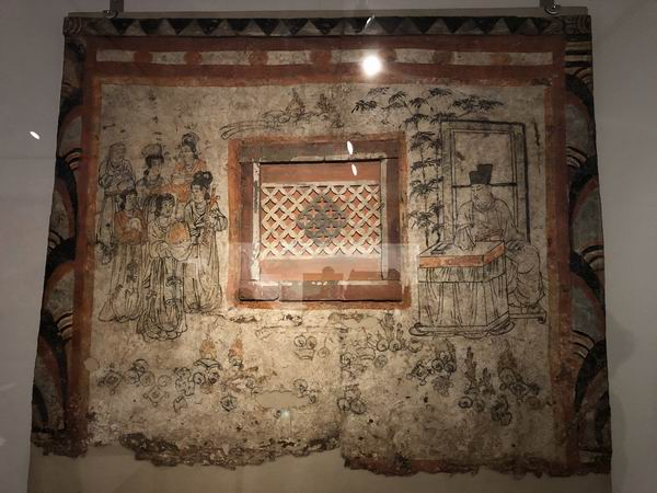 展厅右侧展出的繁峙南关村金代墓壁画,此壁画出自墓室东北壁,壁面正中砌筑一四斜毬纹菱花窗,使得“墓室的墙壁”与“画中的墙壁”有了重合效果。菱花窗右侧绘一名文官,阔面重颐,丰神俊朗。其头戴直脚幞头,着圆领长衫,左手抚膝,右手提笔,端坐于一案前。案上设风字砚方,其背后竖屏风以“象尊者位”,旁立两竿修竹。屏风窄小素净,竹子也以文人画笔法绘就,皆与文官的身份相统一。菱花窗左侧描绘五名侍女、一髡发侍童,分别捧持包袱、蜕巾、渣斗、珊瑚、铜镜等物,面向文官徐徐而来。众侍女除捧珊瑚者梳双环髻,余者皆裹巾团冠,前簪珠饰。画面上下皆散落杂宝。