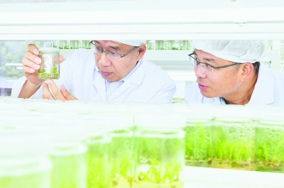 施季森(左)和学生郑仁华在组培室 本报通讯员 黄海摄