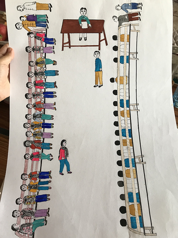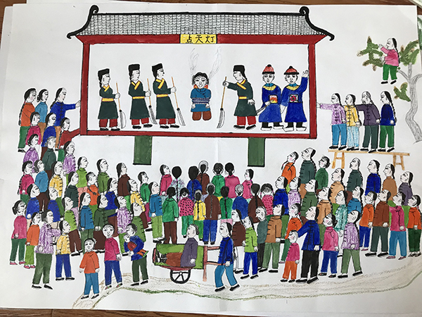 姜淑梅画的“点天灯”——她老家过去对犯下命案的犯人处以酷刑。