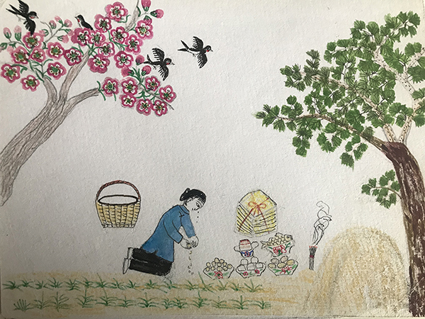 姜淑梅画小时候养的小猪,画集市上唱花鼓戏的、卖白菜萝卜的、跪着要饭的,画自己小时候穿着小红褂儿、梳两个小辫子……