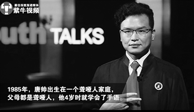 现在,唐帅正在忙于手语翻译协会成立的事情。唐帅说,一旦这个协会成立,就能在很大程度上为聋哑人解决沟通障碍问题,还能承担第三方鉴定职能,在聋哑人案件中确保手语翻译的有效性。此外,它还能为社会输出相关人才,以及推进手语确立统一翻译标准的进程。