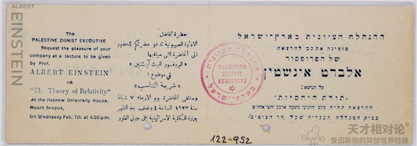 1923年,爱因斯坦在访问日本的回程中到访巴勒斯坦,在耶路撒冷希伯来大学未来的校址上举行建校科学讲座,并成为首位“特拉维夫荣誉市民”,与弗洛伊德、布伯、魏茨曼等共同成为第一届希伯来大学的校董成员。