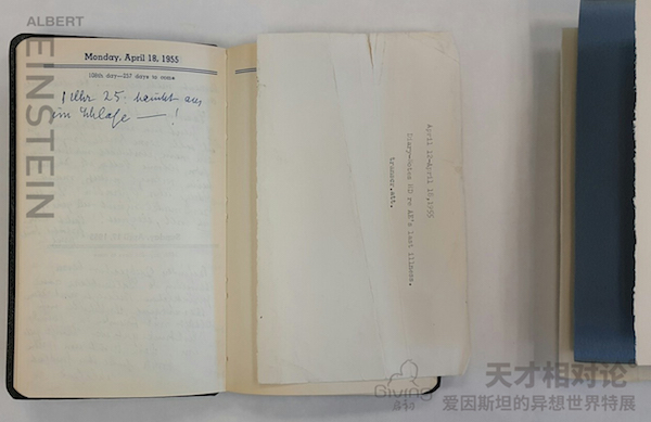 爱因斯坦秘书——海伦·杜卡斯的日记。杜卡斯多年来担任爱因斯坦的秘书、管家、档案保管员及财产管理人。这本小小的仿真皮日记上,印着爱因斯坦的名字,内容为1955年4月12日到4月18日,记录爱因斯坦生病到后来过世的事情。