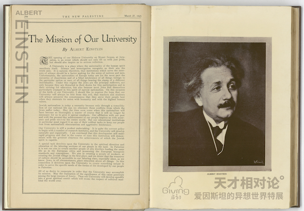 “希伯来大学的使命”,刊于1925年《新巴勒斯坦》。爱因斯坦的致辞描述了这一新机构对人类的预期贡献,明确地指出了科学工作的普遍原则,并且警告狭隘的民族主义。