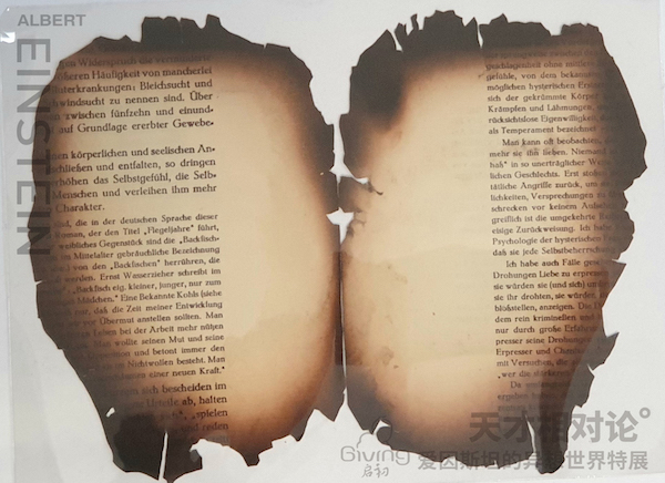 一本德文书的其中两页,边缘烧焦。这几张是从一堆纳粹党烧掉的“非法”书籍当中救回的书页,在宣传部长约瑟夫·戈培尔的命令下,纳粹党于1933年5月10日柏林歌剧院广场进行焚书运动。爱因斯坦的书也被列为非法书籍。这两页是Reuven Mass先生亲手从火中救出,继而得以保存下来。
