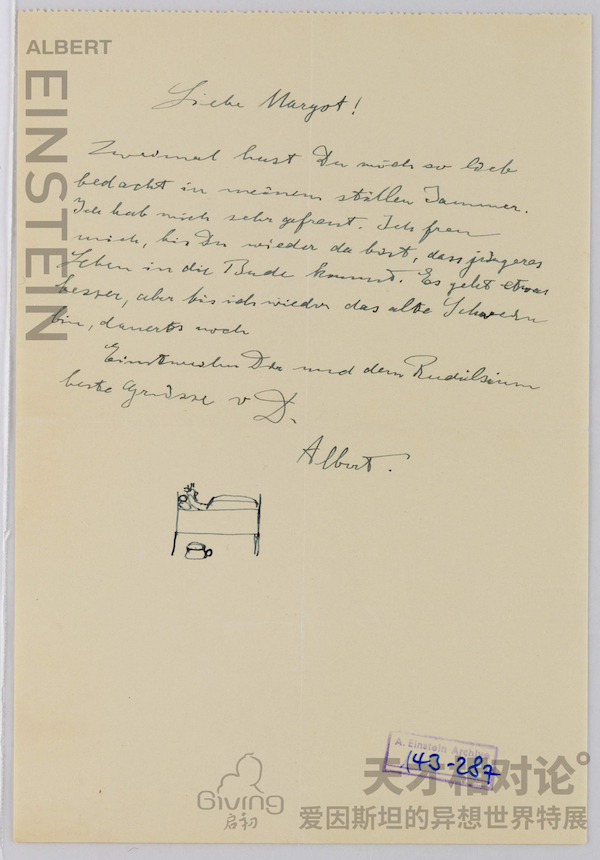 因严重的心脏问题而卧病在床的爱因斯坦,感谢玛戈特这位对他不离不弃的女儿从瑞士阿尔卑斯山来信慰问。他期待她回来,因为这会让家中的气氛活泼起来。