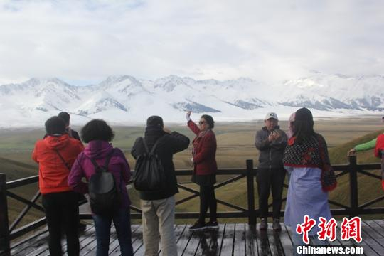 9月11日,游客在那拉提空中草原拍雪景。 陶拴科 摄