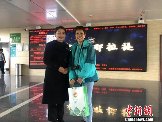 来自四川成都的曹永美(右)女士成为那拉提旅游景区2019年的第一百万名游客,她与景区工作人员合影留念。 陶拴科 摄