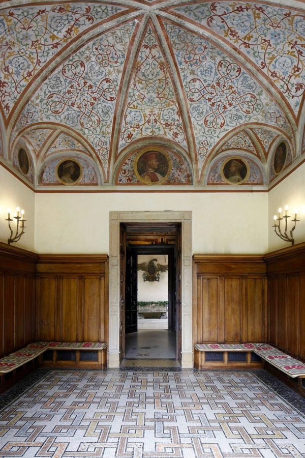 画像里的人是斯福尔扎家族中各位重要人物及其配偶,而绘制他们的则是曾经和达·芬奇一起工作过的意大利画家伯纳迪诺·卢伊尼以及他的四个孩子。有意思的是,阿特拉尼之家里的这些人像并非原迹,1902年,真品被米兰政府购下,至今收藏在斯福扎尔城堡里,但花草纹样装饰画是16世纪的真迹,仍能让人欣赏画家细腻的笔触。