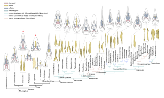鸟类是唯一留存下的恐龙后裔。它们不仅跨过了约6500万年前的白垩纪大灭绝,而且成功演化成了如今多样性最高的脊椎动物之一。鸟类的成功演化与其种种有关飞行的结构相关,也与其特殊的头骨构造密不可分。从非鸟兽脚类恐龙到真正的鸟类,头骨发生了一系列变化,如面部缩短、脑颅扩大、眼眶周围骨骼退化,以及骨骼纤细化和彼此间关节退化消失。尤其特殊的是,现生鸟类主要是新腭类具有高度可动的头骨,体现在其上颌能够相对于脑颅进行灵活地移动,而非鸟恐龙的头骨则不具备这样的可动性。