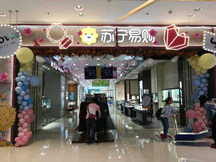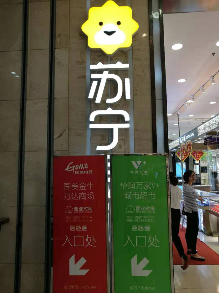金牛万达百货分布于购物中心的一至四层,与万达广场仅仅一墙之隔,没有明显的分界线。不过红星新闻记者发现,每一层分隔区的横梁和门柱上都已换成了苏宁易购的标志。一楼珠宝区的销售人员告诉红星新闻记者,苏宁易购的标志是8月出现的,由于改造速度很快,她们几乎没有注意到具体是什么时间更换的。