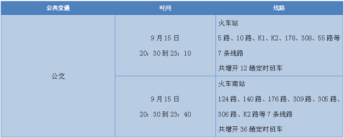 9月15日夜间,火车站5路、10路、K1、K2、178、308、55路等7条线路将于20:30到23:10之间增开共12趟定时班车,
