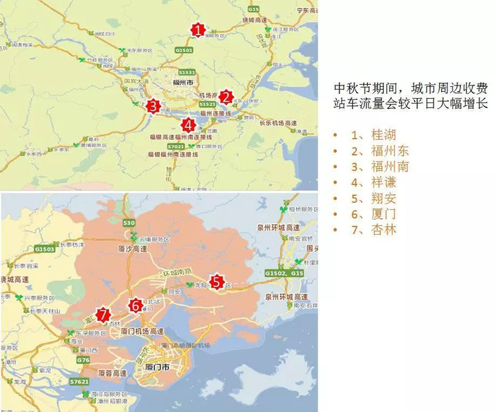 中秋小长假期间,返乡探亲和外出游玩人员相互叠加,可能对高速公路通行带来一定影响。节日期间桂湖、福州东、福州南、祥谦、翔安、厦门、杏林等城市及景区周边收费站车流量将有明显增多。