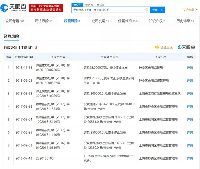 目前,无印良品(上海)商业有限公司共有8条行政处罚信息。