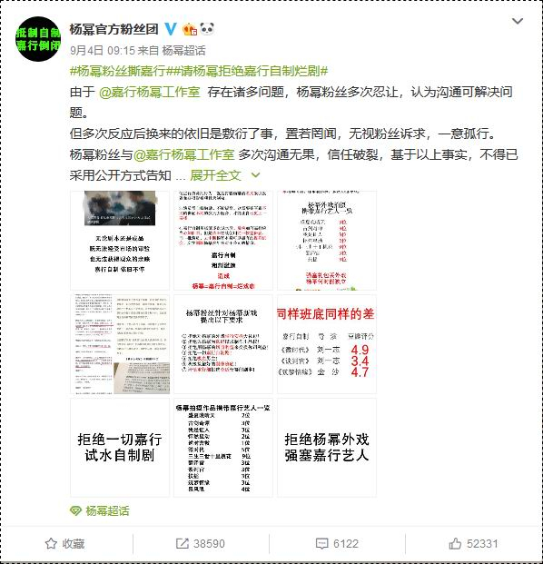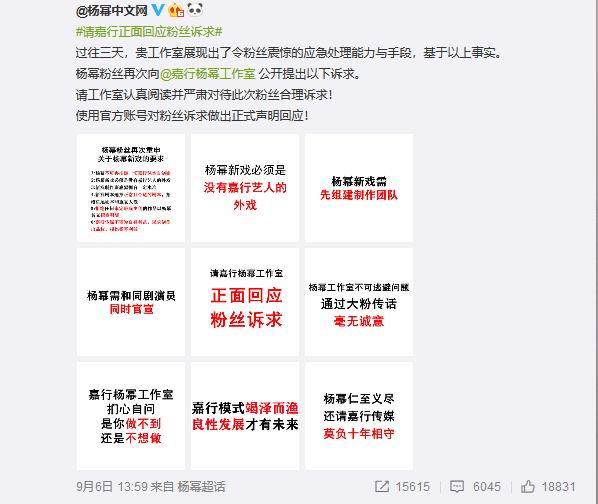 与“影视寒冬”相伴相生的是娱乐圈的“多事之秋”。9月4日,带有“蓝V”标识的“杨幂官方粉丝团”通过微博账号发布消息,号召杨幂粉丝抵制杨幂参演所在公司嘉行传媒的“自制剧”,并出现了杨幂粉丝在杨幂线下商业活动现场手举标语的场景。9月6日,同样带有“蓝V”标识的“杨幂中文网”也通过微博账号重申“杨幂官方粉丝团”的诉求,抵制杨幂出演公司项目,要求公司安排杨幂接“外戏”。