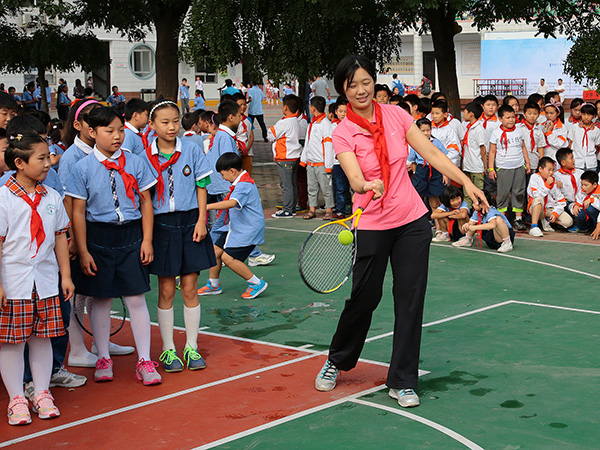 河南省郑州市,孙甜甜给孩子们示范网球基本动作。