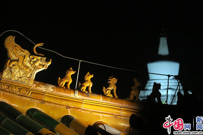 2019年9月14日,金秋时节,北京北海公园——中国迄今保留下来的历史最悠久、保护最完整的皇家园林,夜景绚丽夺目,公园内高耸白塔与凉亭的琉璃飞檐在夜色中相映成趣。孙自兵法/IC photo