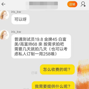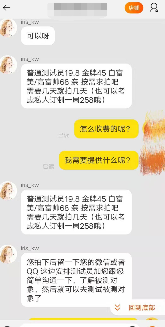 通过与店家客服咨询得知,用户在平台选择服务种类后,店家将安排测试员联系用户,通过与用户沟通,了解被测试对象↓↓
