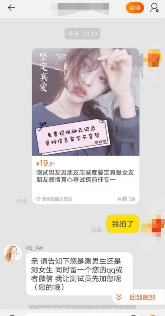 “恋人忠诚度测试”真的有效?据了解,目前淘宝、闲鱼等电商平台上仍有众多商家提供类似服务,他们自称测试员都是经过专业训练的,通过简单的聊天便能给出“结果”。