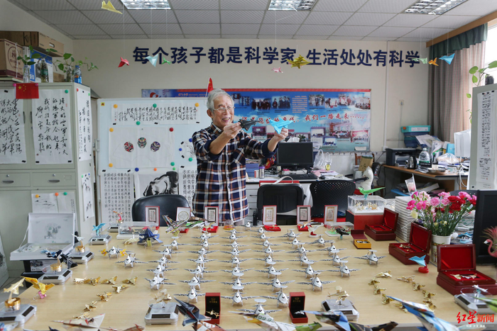 9月15日,赶在国庆节来临前,老人将存放在成飞小学一间工作室的纸飞机拿了出来,摆上了两张大长桌子,中国各个系列的歼击机、运输机、预警机、客机……琳琅满目,有如图钉般精巧的艺术品,也有手臂长短的“重型杀器”。而上千只纸飞机,在老人的折纸生涯中,也只能算屈指可数的一小部分。