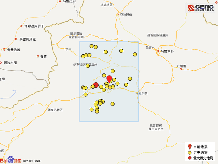 历史地震:根据中国地震台网速报目录,震中周边200公里内近5年来发生3级以上地震共151次,最大地震是2017年9月16日在新疆阿克苏地区库车县发生的5.7级地震(距离本次震中76公里),按震级大小前50次历史地震分布如图。