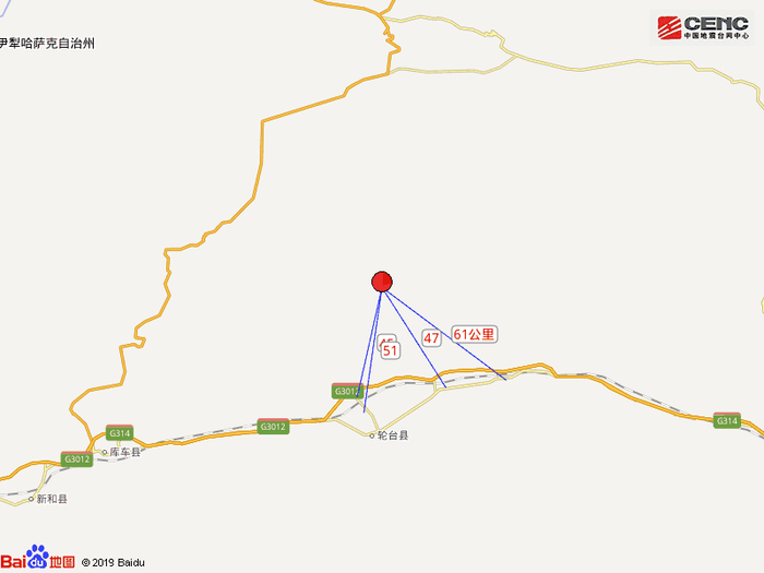 周边县城:震中距轮台县61公里、距库车县130公里、距新源县150公里、距新和县165公里、距库尔勒市168公里,距铁门关市124公里,距乌鲁木齐市316公里。