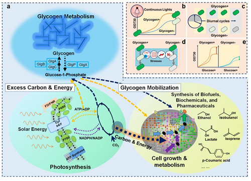 光合生物制造技术是指以光合生物为平台,将太阳能和二氧化碳直接转化为生物燃料和生物基化学品的技术,可以在单一平台、单一过程中同时取得固碳减排和绿色生产的效果。蓝细菌是极具潜力的光合微生物平台,相比较于高等植物和真核微藻,具有结构相对简单、生长快速、光合效率高、遗传操作便捷等优势,易于进行光合细胞工厂的开发。蓝细菌光合细胞工厂开发和优化的重要方向是对胞内光合碳流分配模式的调控和重塑,使更多的碳流向目标代谢产品的合成。糖原代谢是蓝细菌中重要的天然碳汇机制,储存了光合作用固定的碳和能量中超出细胞生长代谢所需的溢出部分。蓝细菌代谢工程领域传统上将糖原合成视为光合细胞工厂中目标产物合成的重要竞争途径,目前已经有大量通过阻断和弱化糖原合成途径来提高目标产物合成、优化蓝细菌光合细胞工厂效能的尝试案例,然而大多数案例未能取得效果,不同研究团队的类似操作甚至取得了矛盾的结果。