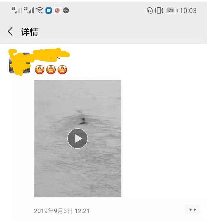前述何姓工作人员介绍,9月3日上午,他的船靠岸,他站在船上,看到江水里一个黑色的塑料袋一样的东西摆来摆去,觉得很像一个动物在游,就拍了下来,随后于当日12时21分发在了微信朋友圈。