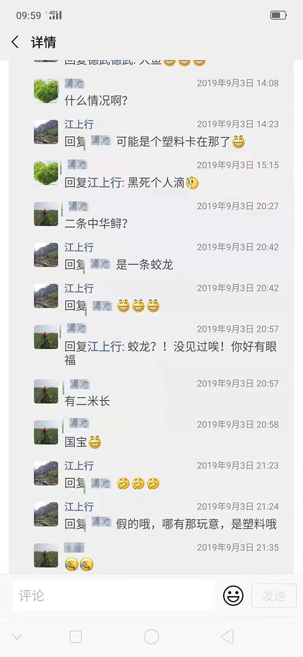 何姓工作人员朋友圈的前述视频很快被很多人评论。“怪兽”,“蛟龙”,“中华鲟”,“国宝”,“大化鱼”?他随后在评论区解释说,“可能是个塑料卡在那了”,“假的哦,哪有那玩意,是塑料哦”。