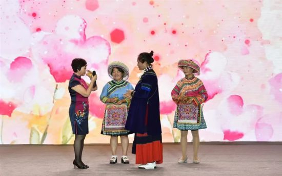 2019年,在“春蕾的故事”分享会上,王福美(右一)、吉地莫史刘(右二)、见到了她们的资助者周洁冰女士(左一),深情地向她敬上一杯苦荞茶。